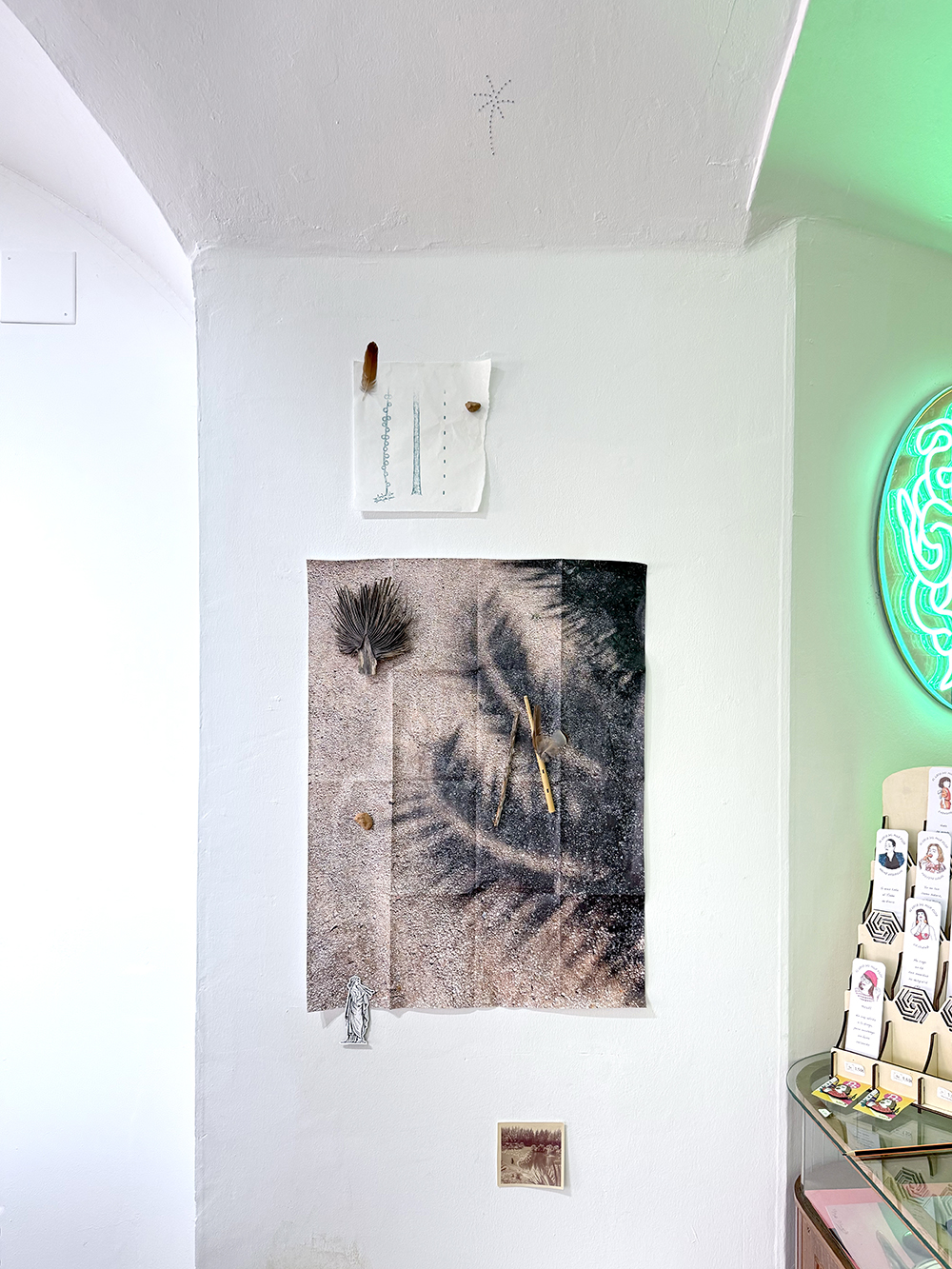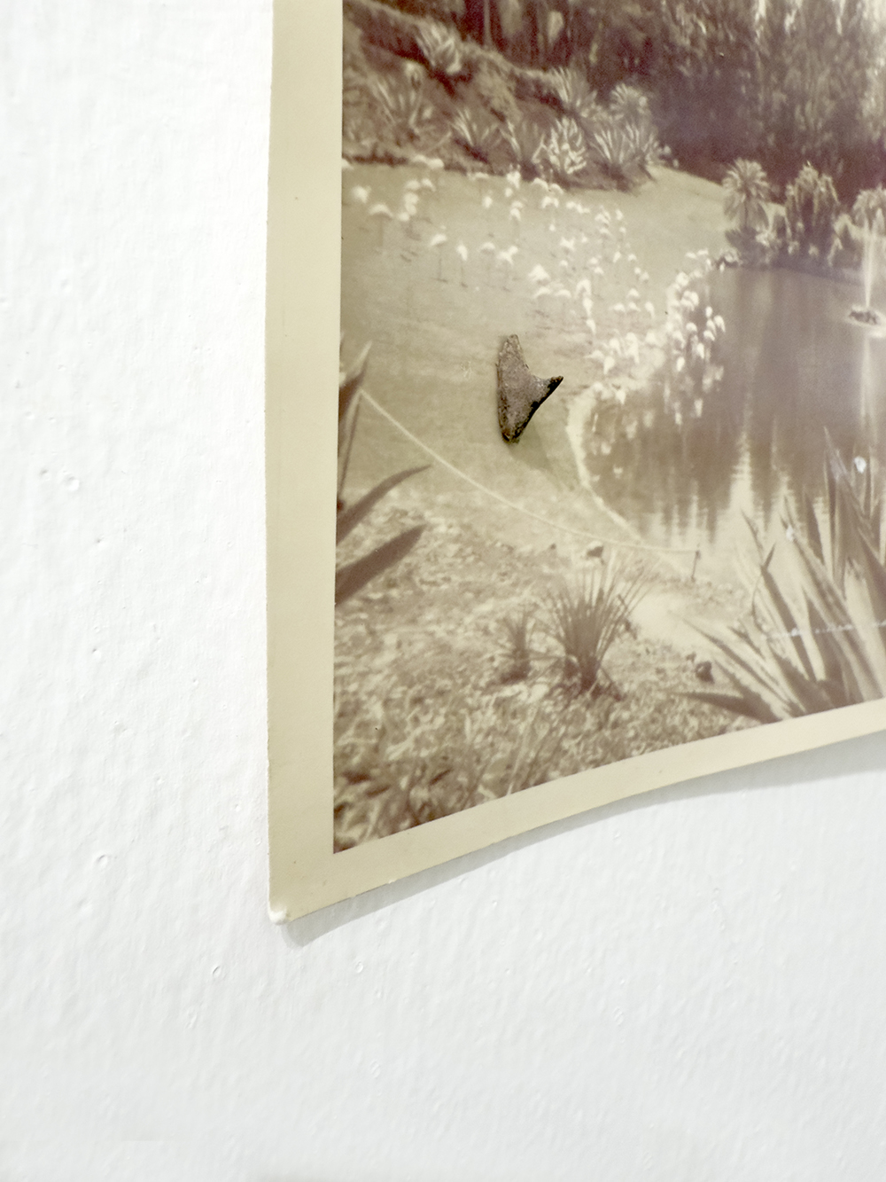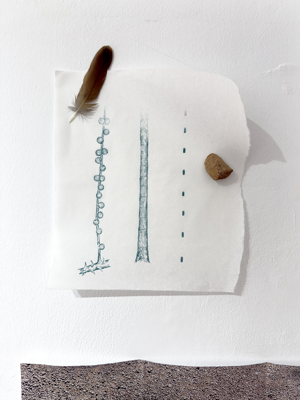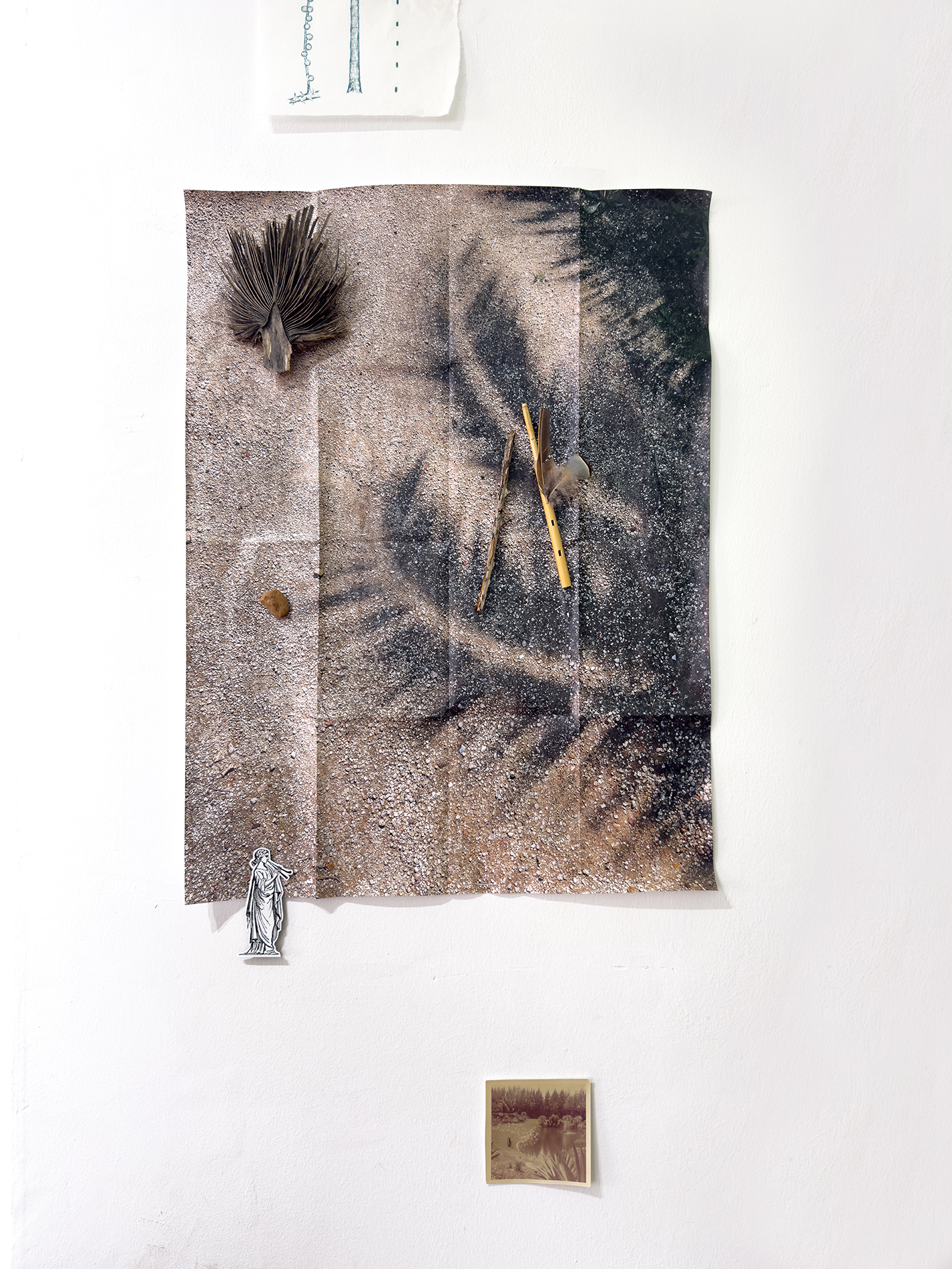 Fotografía plegada, piedras, plumas, fragmento de palmera, rama, flauta de madera, imán, diamantes, fotografía antigua y lápiz de color sobre papel de algodón.