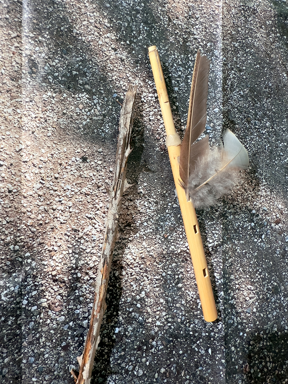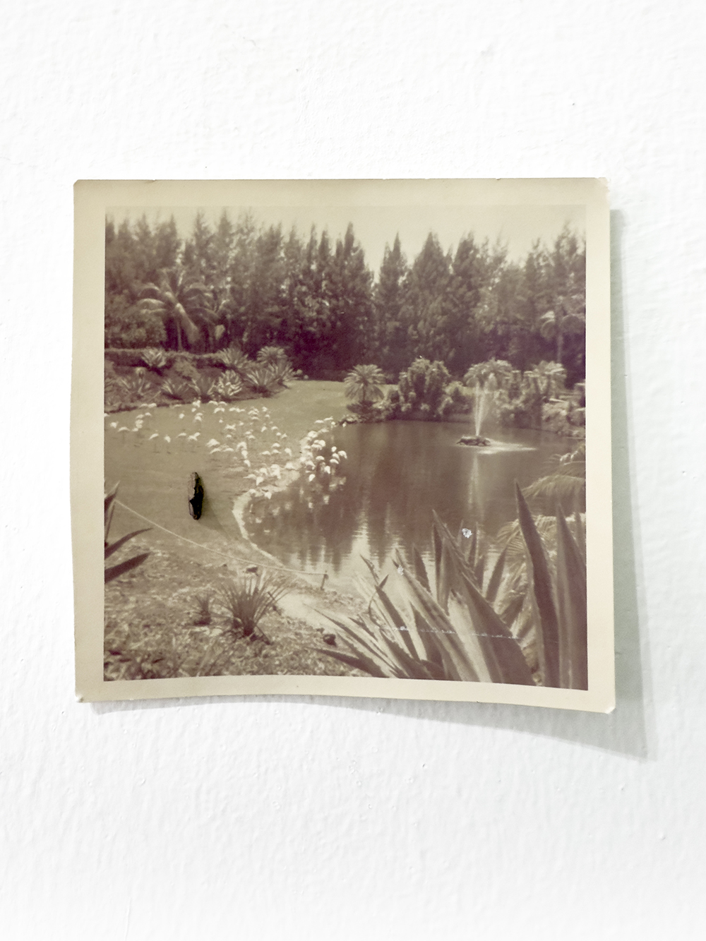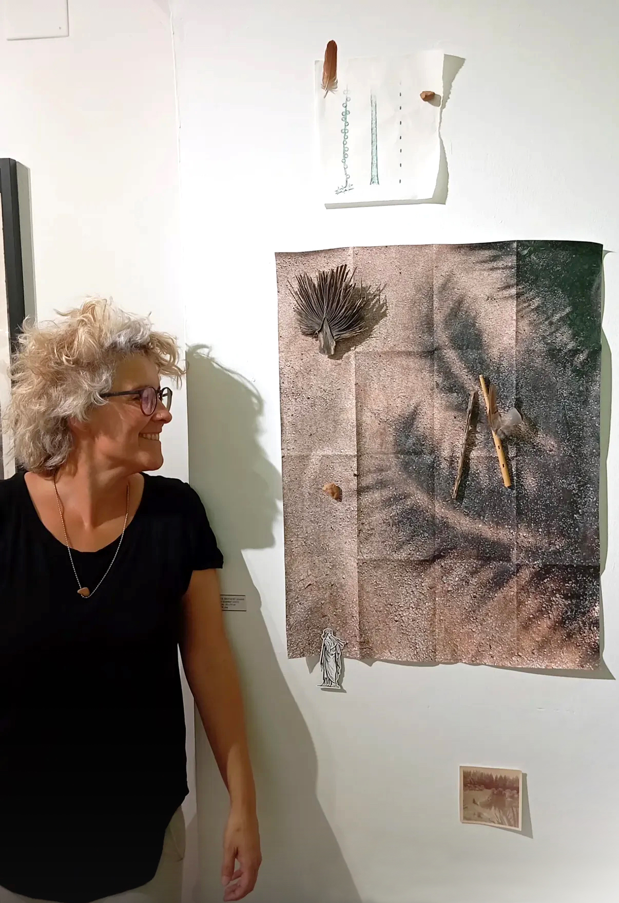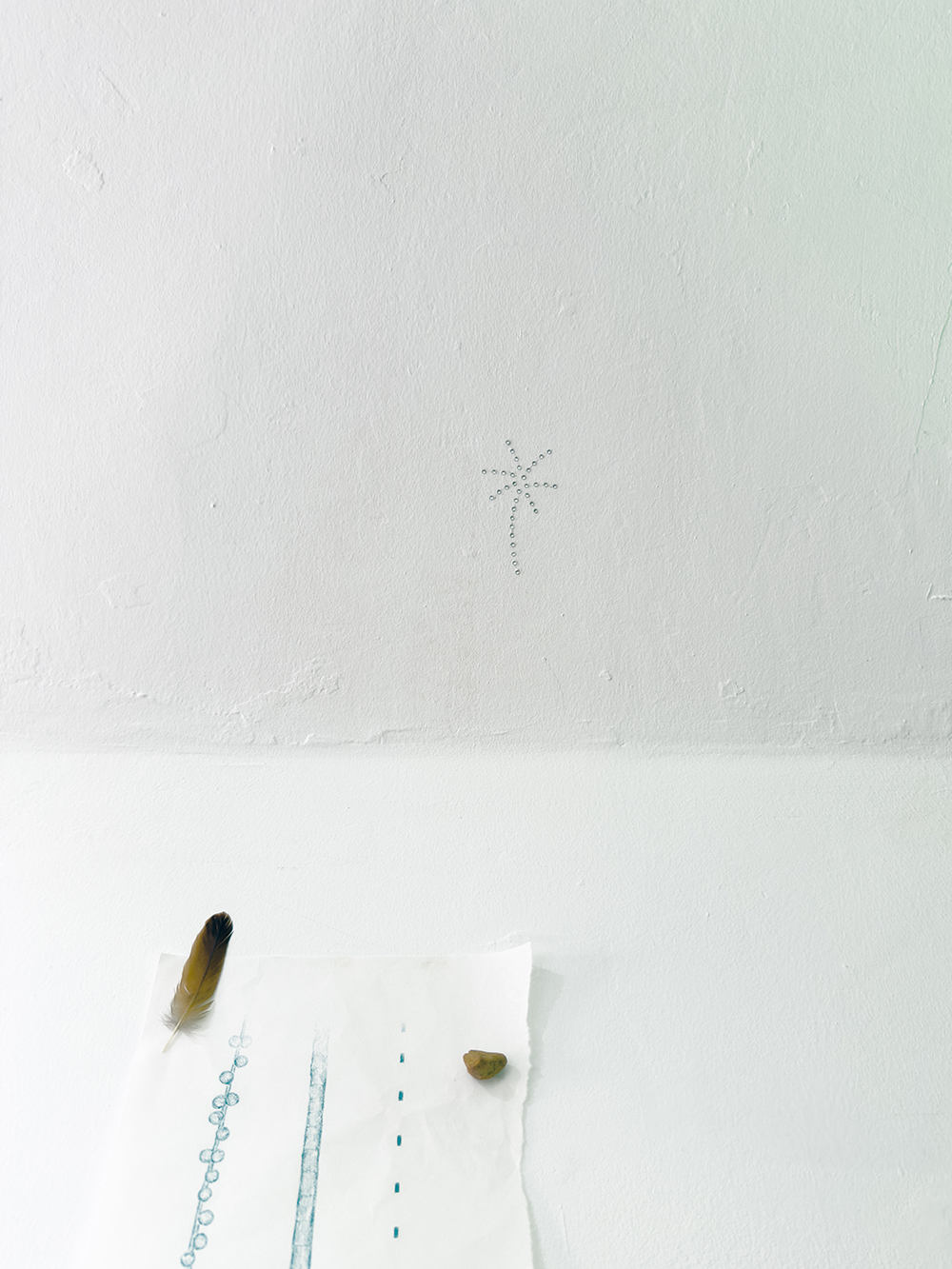 Fotografía plegada, piedras, plumas, fragmento de palmera, rama, flauta de madera, imán, diamantes, fotografía antigua y lápiz de color sobre papel de algodón.