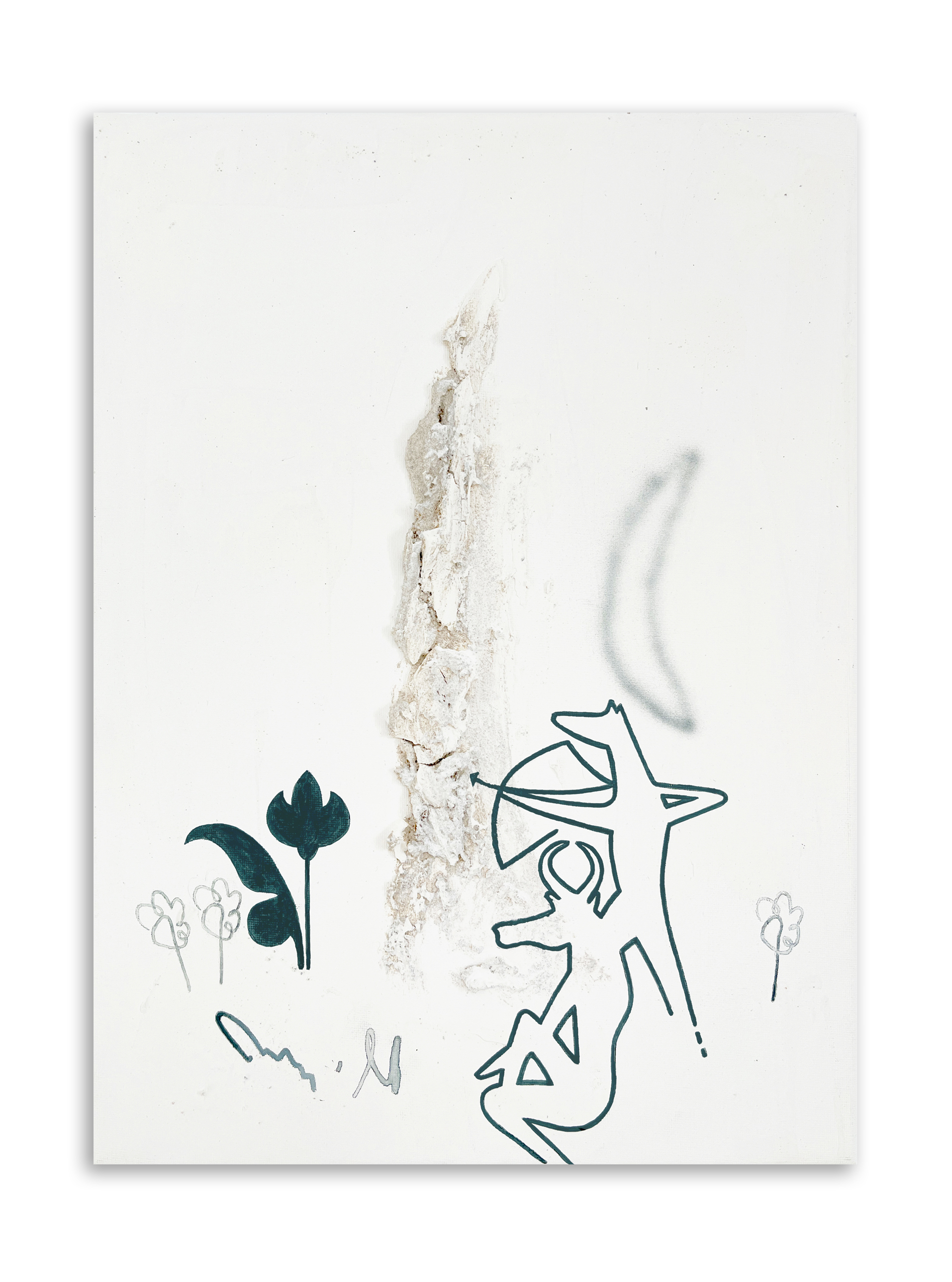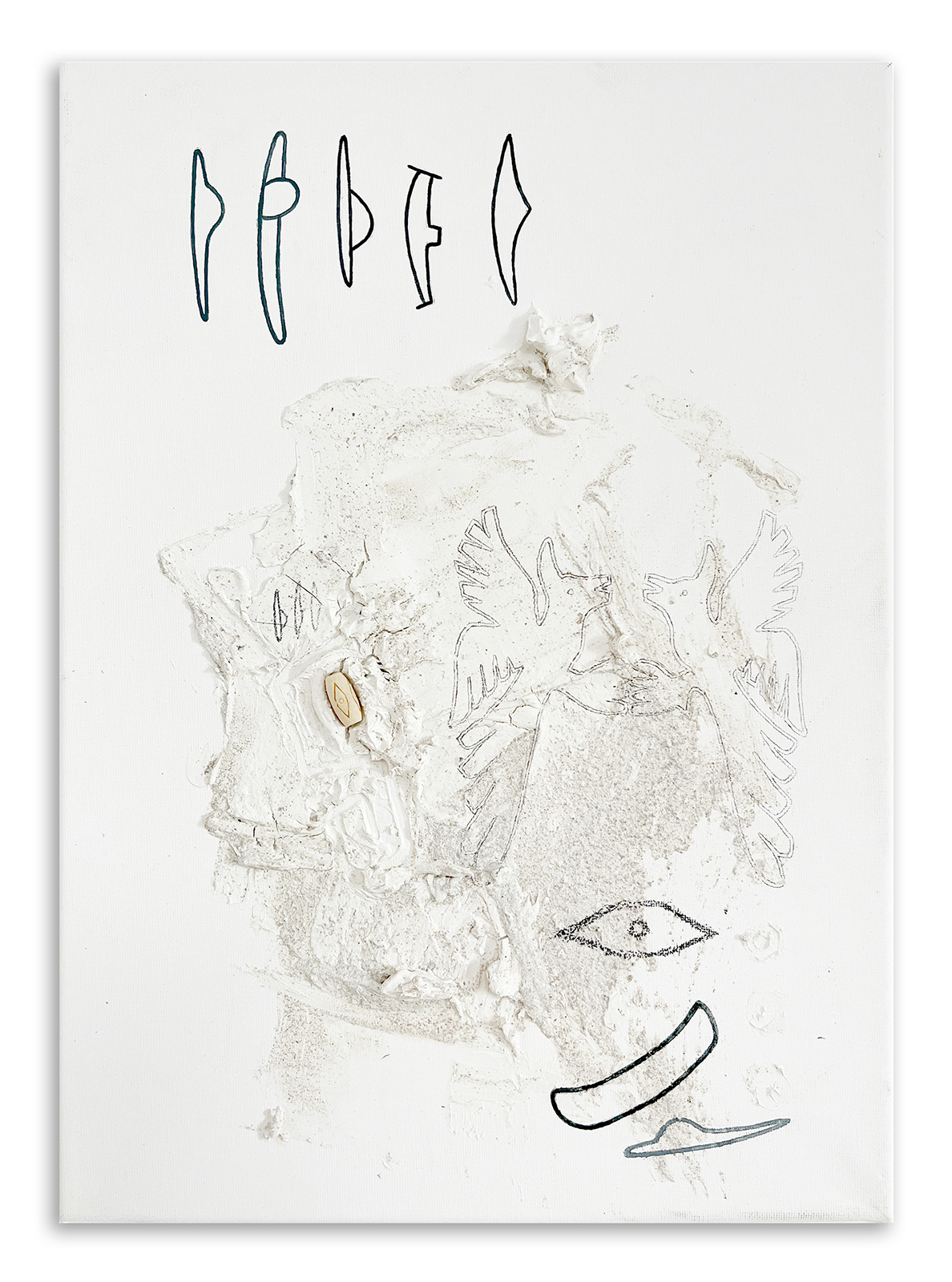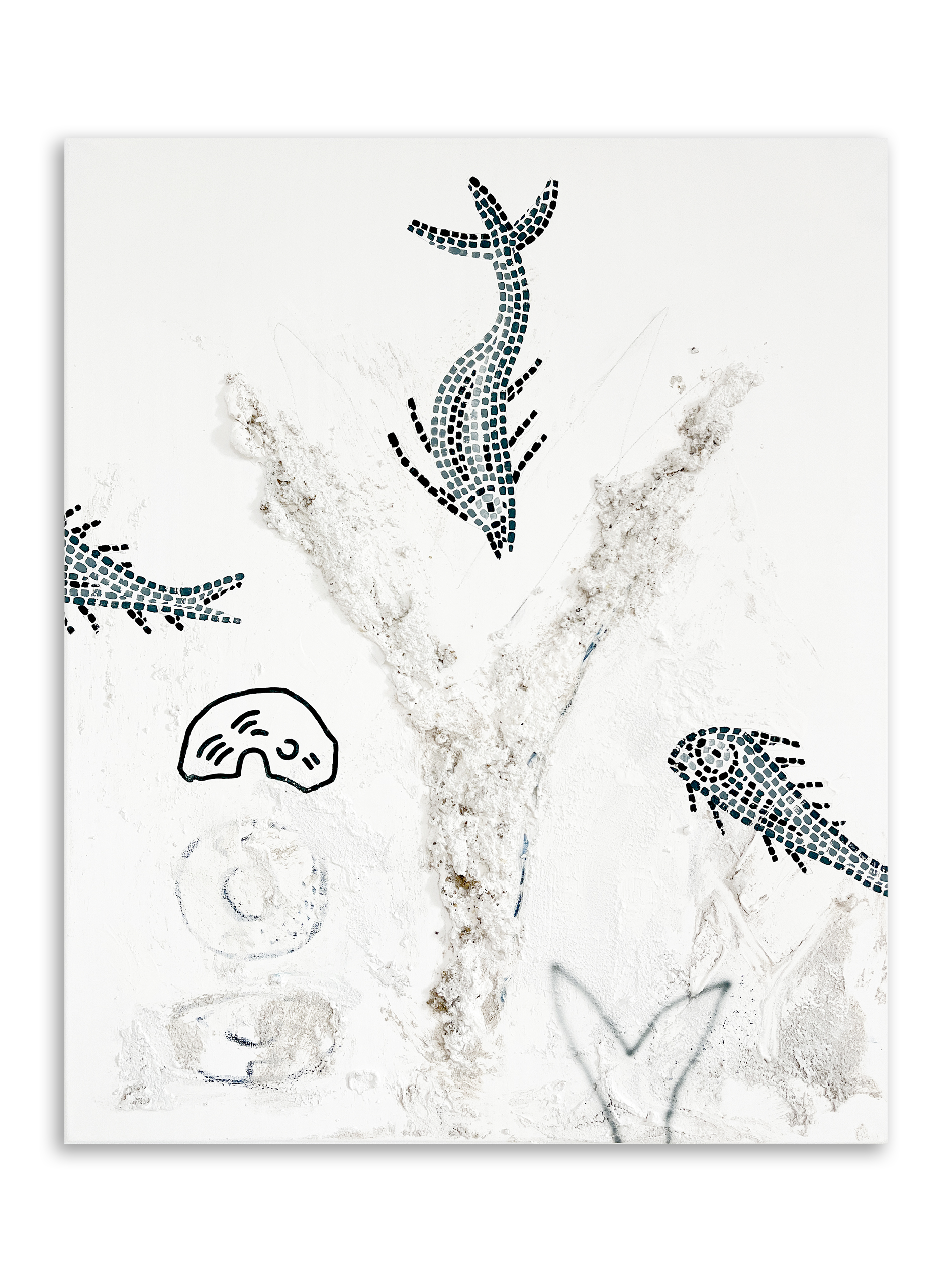 Acrílico, acuarela, arena, piedras, grafito, lápices de colores y agua de lluvia sobre lienzos.