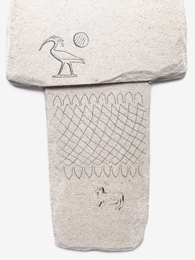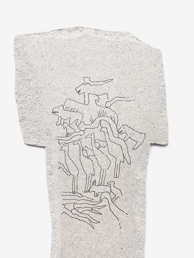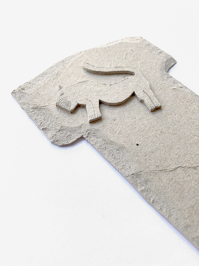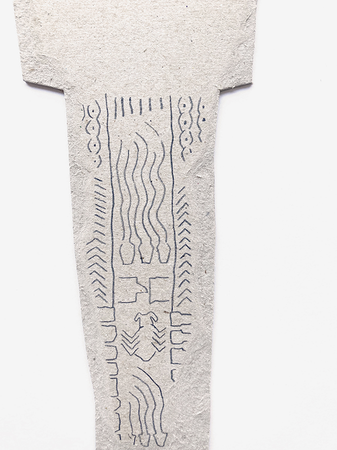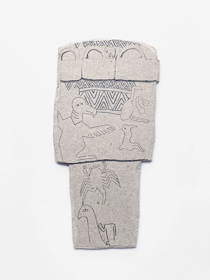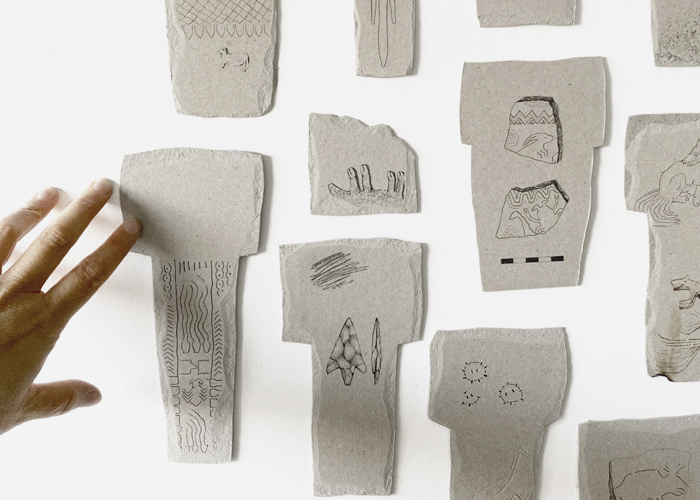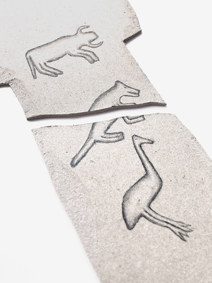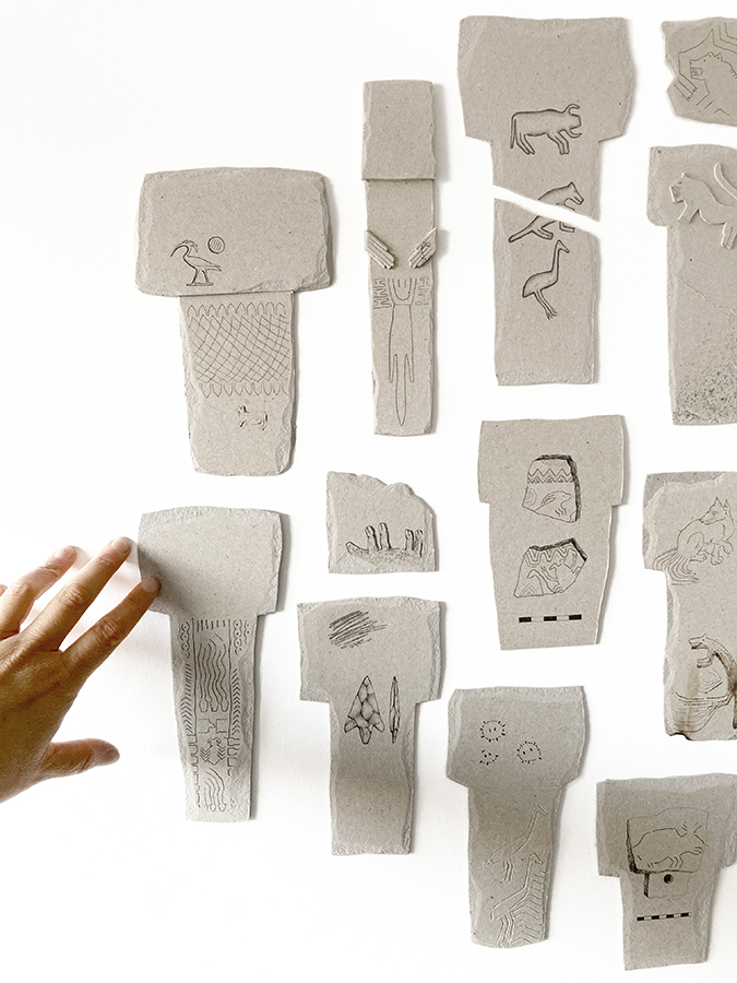 En ese recuerdo vago (en mi mente) aparecen también dibujos de otras culturas como la china o la egipcia, así como elementos de mi propio imaginario personal. Es por ello que aparecen en las piezas, mezclados con los animales originales de los monolitos y los pictogramas abstractos del lugar.