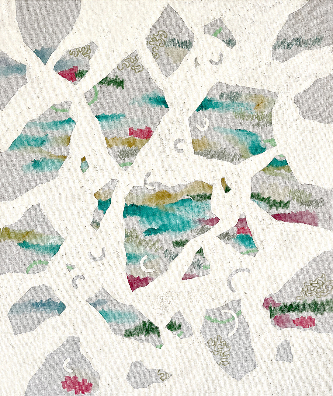 La muestra exhibe áreas donde lo orgánico se fusiona con una fluidez natural, como los lazos de la vida que se fusionan en armonía. Contrastan con zonas definidas donde lo artificial se introduce en lo natural, como una presencia que desdibuja la esencia primigenia.