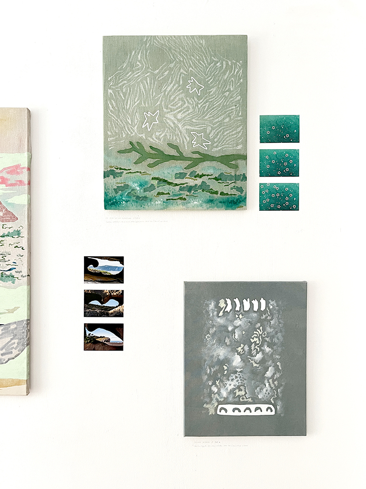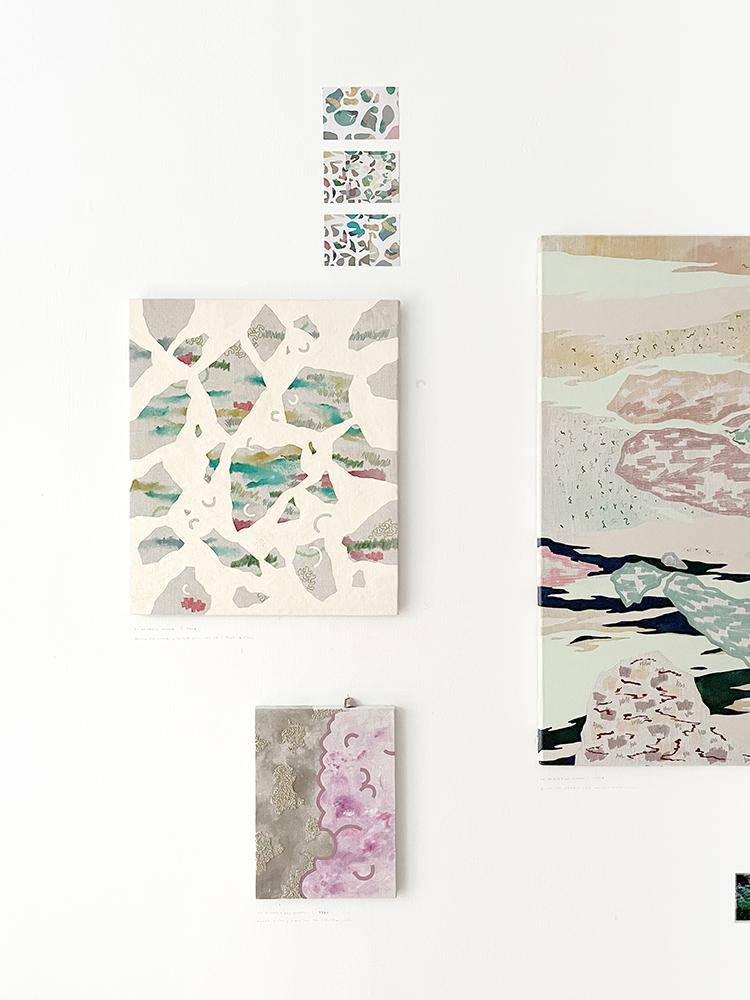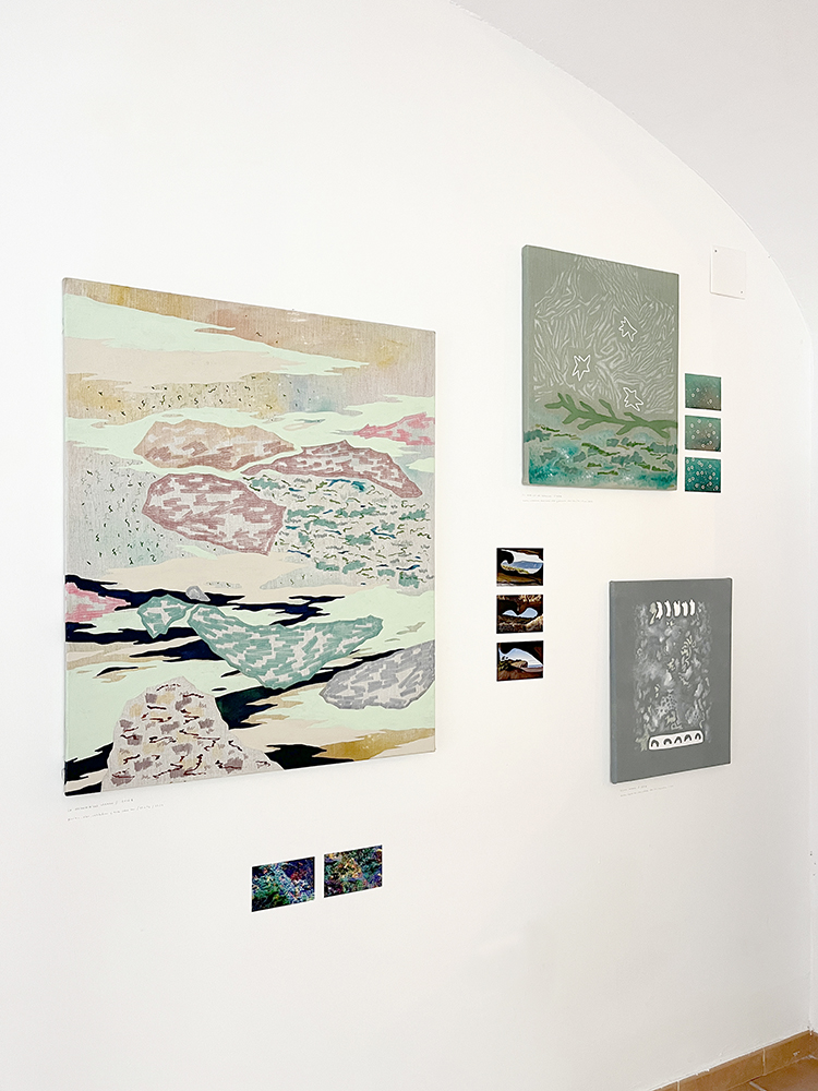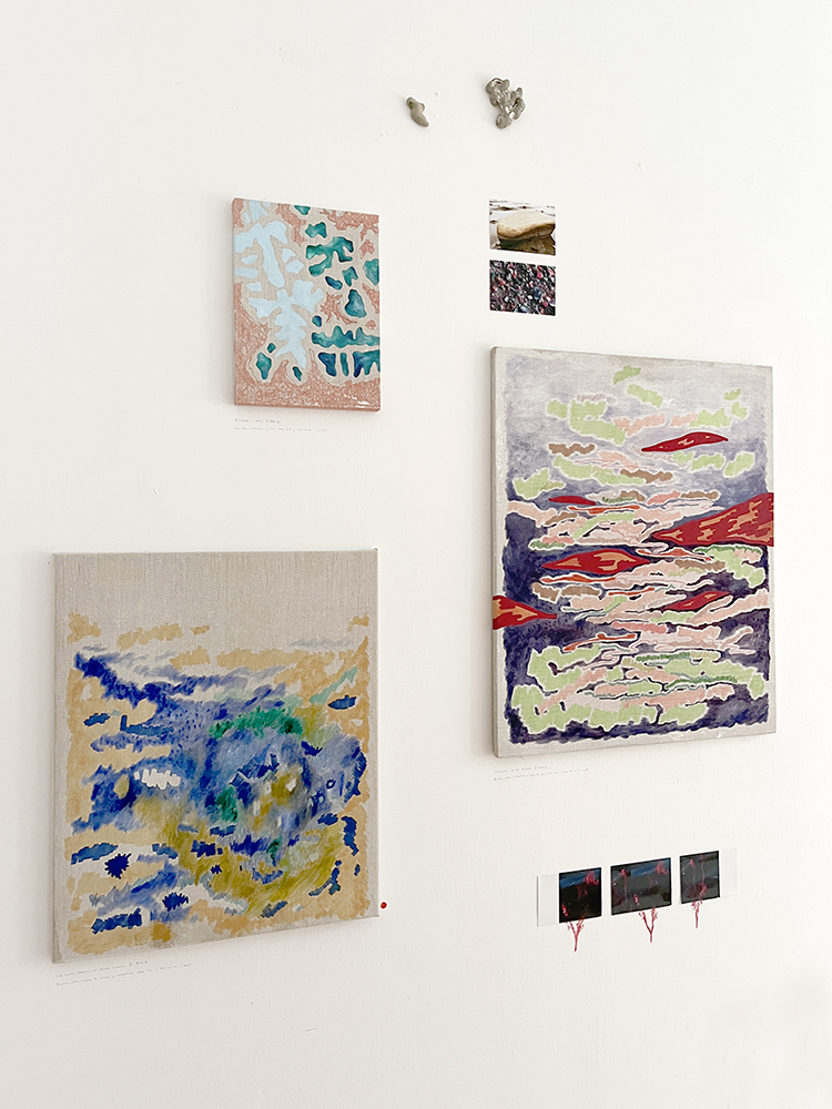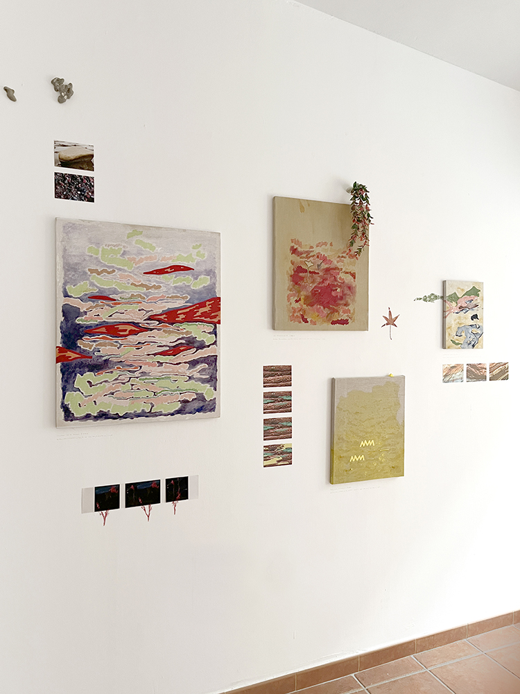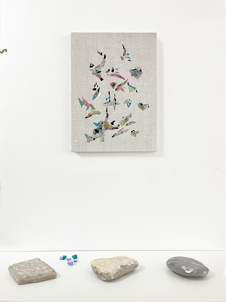 Pinturas de técnica mixta sobre lino, fotografías de IA, piedras y plantas de plástico.