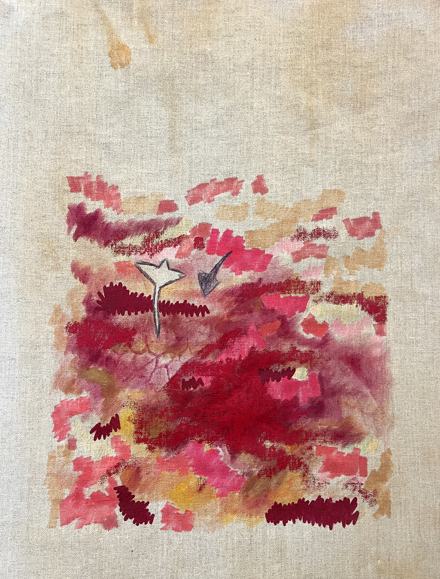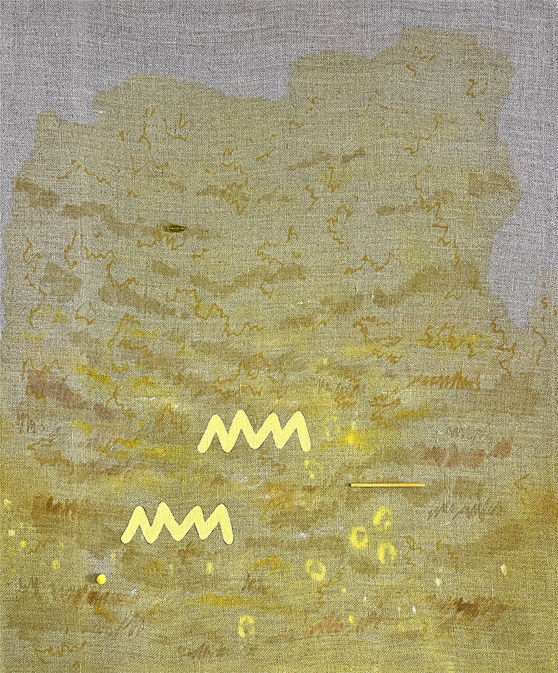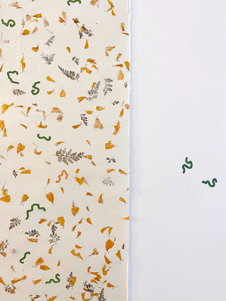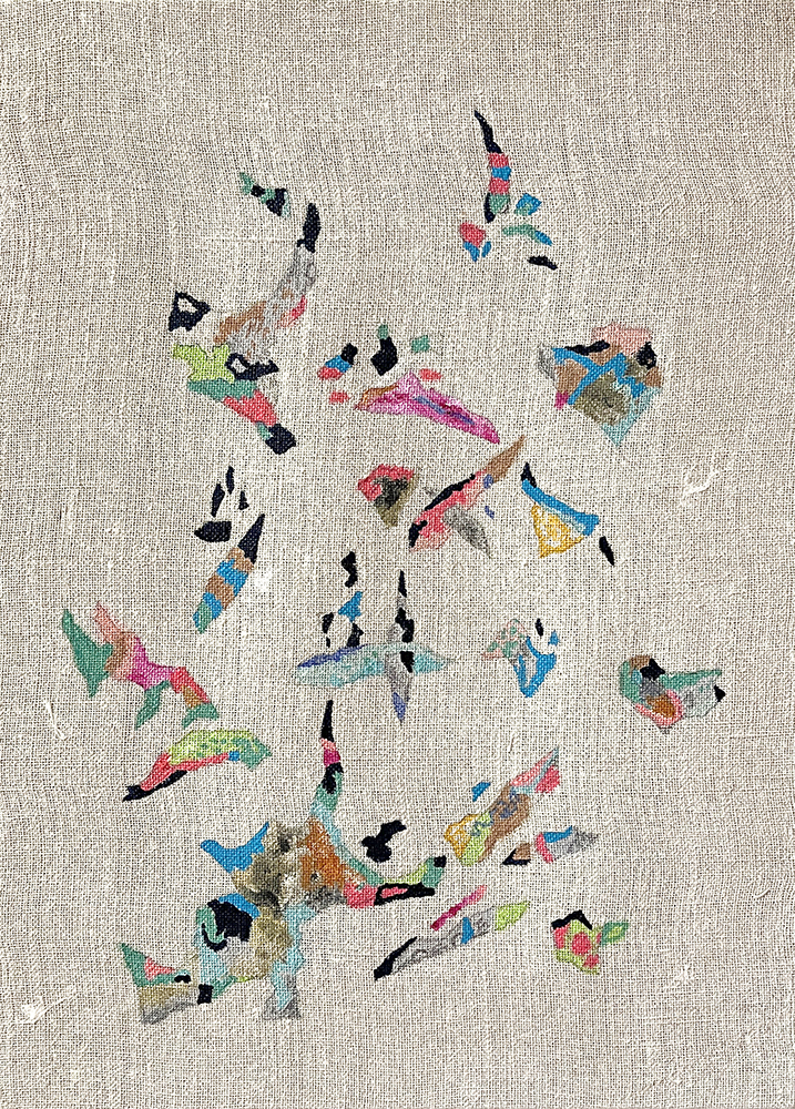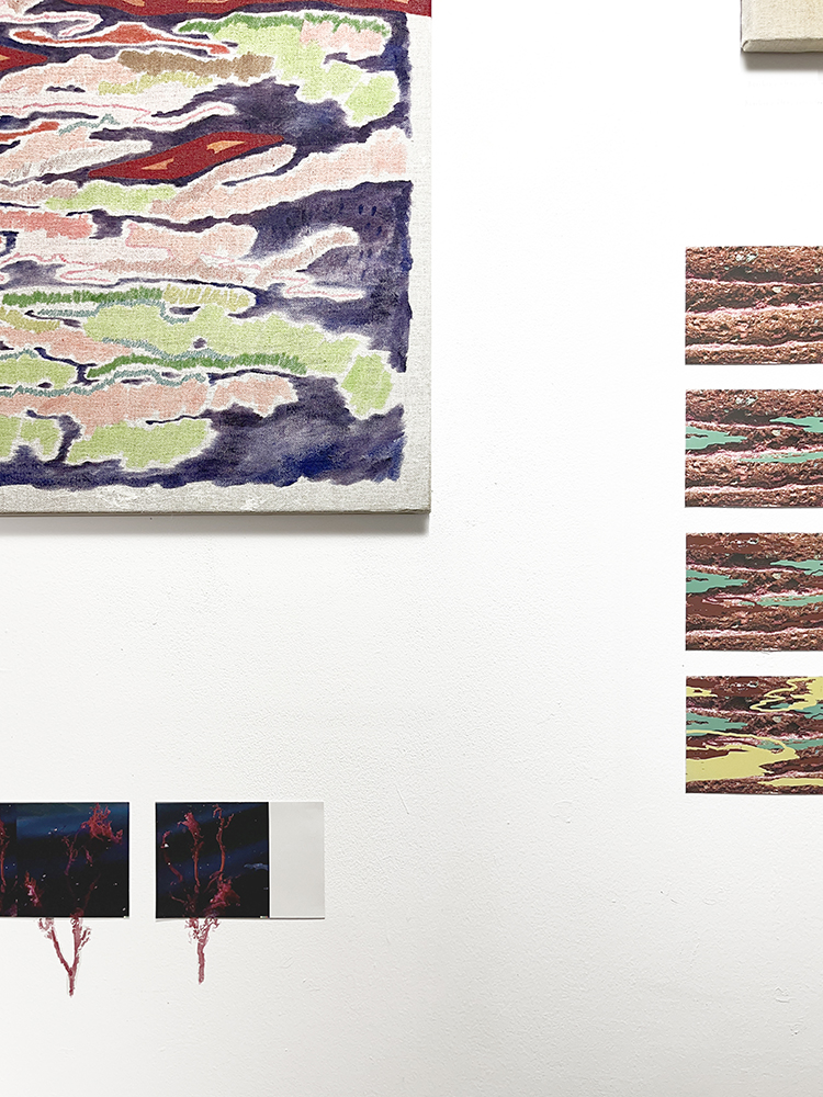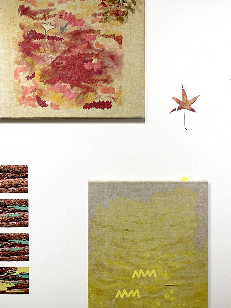 Pinturas de técnica mixta sobre lino, fotografías de IA, piedras y plantas de plástico.
