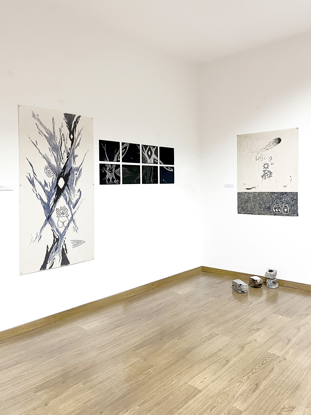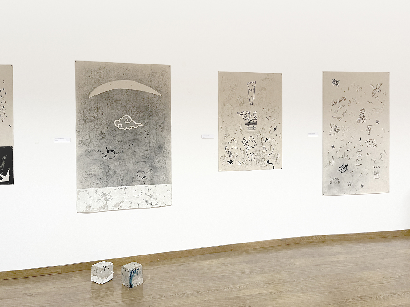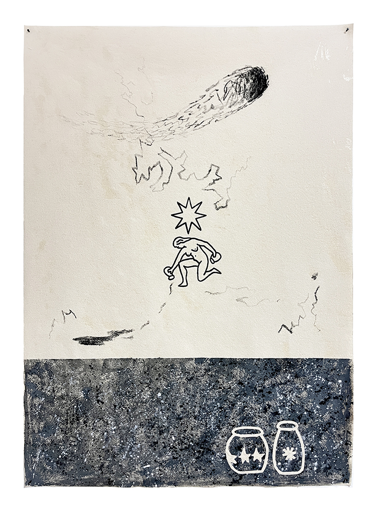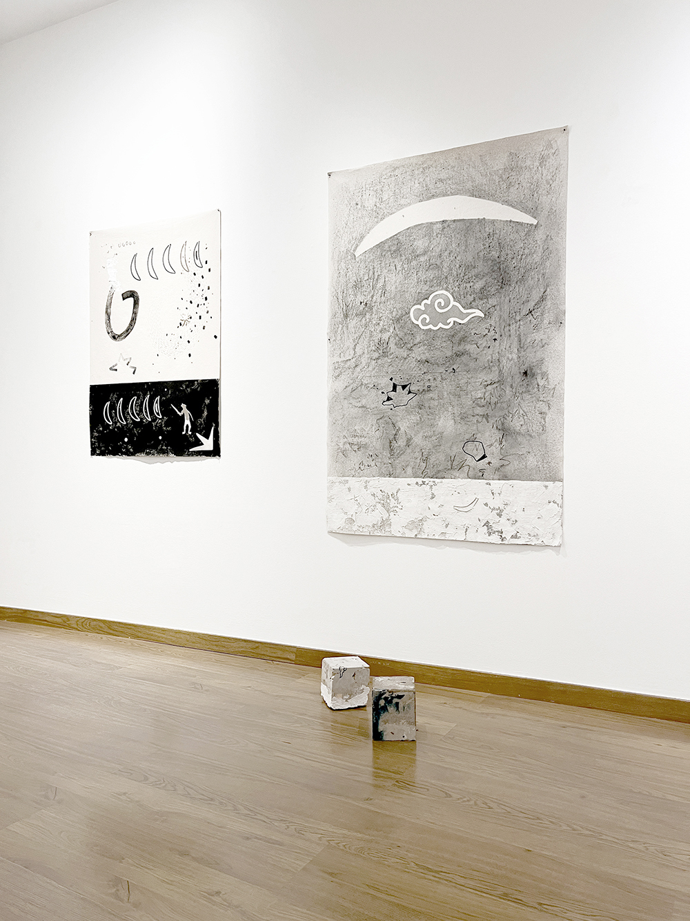 Todos estos usos que hemos dado a las estrellas son los que conforman la exposición. Las piezas están realizadas con materiales naturales diversos como agua de lluvia, cartón, tela, arena, pizarra, arcilla y mármol, y técnicas como acrílico, acuarela, grafito y pastel.