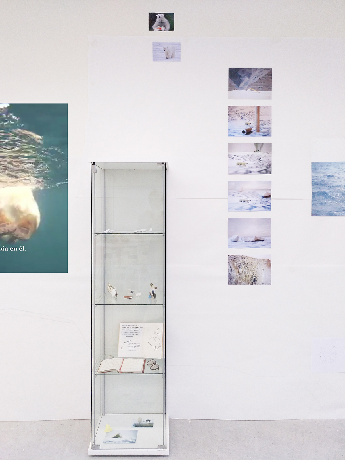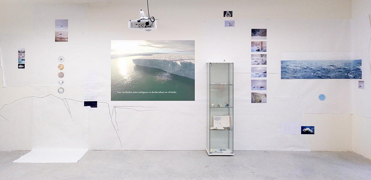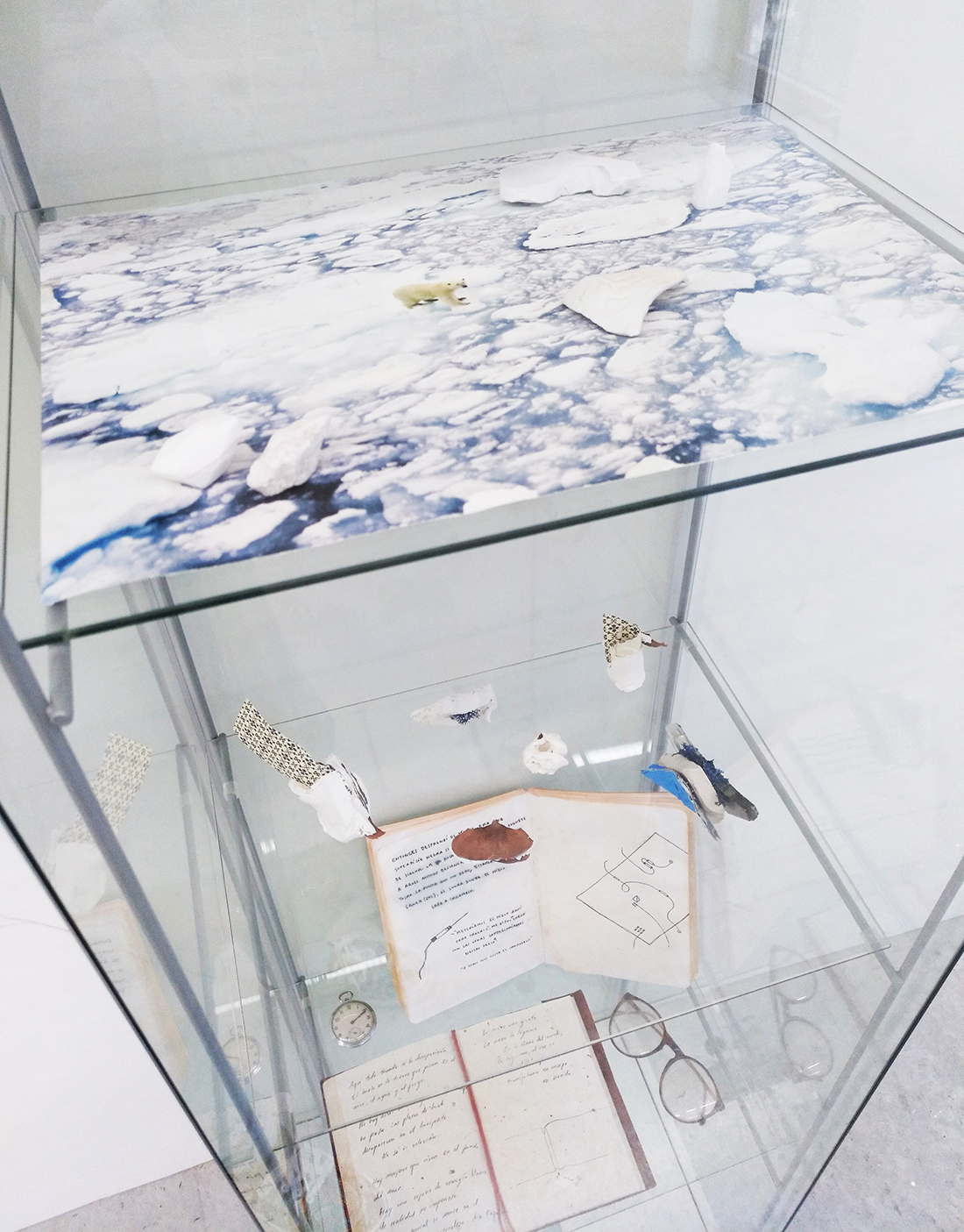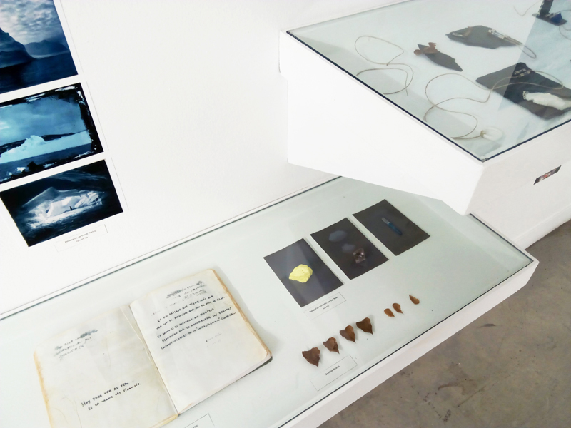 Formalmente se presenta una instalación en la que encontramos una vitrina, una estantería, fotografías y dibujos. En el interior de la vitrina hay objetos personales (gafas, un anillo, una brújula, etc.), elementos naturales (rocas, fósiles…) y dos diarios de dos personajes: un explorador polar que estuvo allí antes de 1980 (fecha desde la que existe el Polo Norte según nuestra manera de saber y contar) y Frank Hurley, fotógrafo polar cuya mirada es una de las que conforma nuestro conocimiento del lugar.
