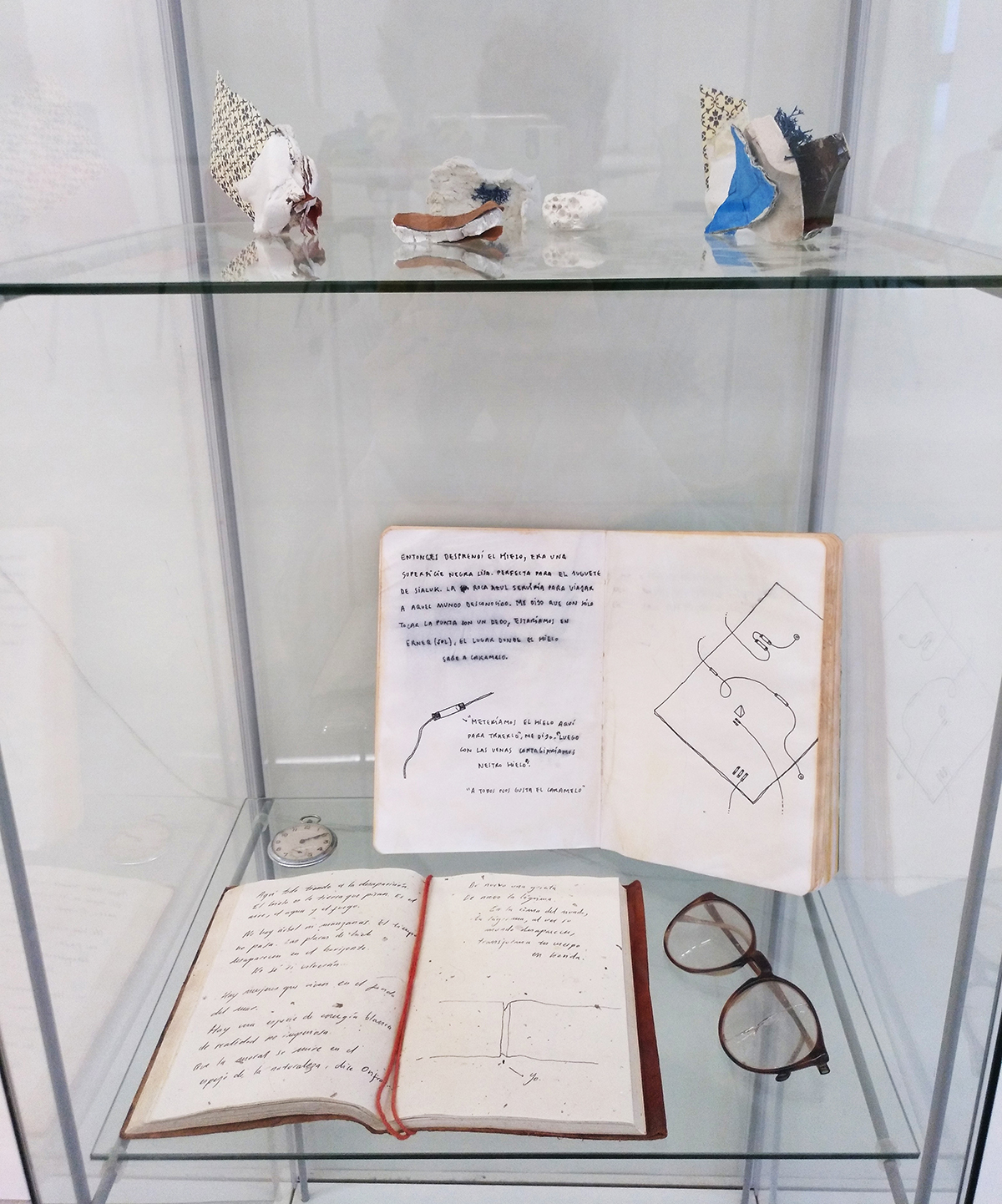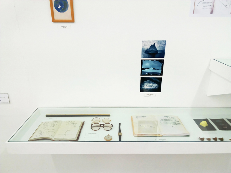 Fotografías, elementos naturales, elementos personales, diarios, dibujos, textos, vitrina y estantería.